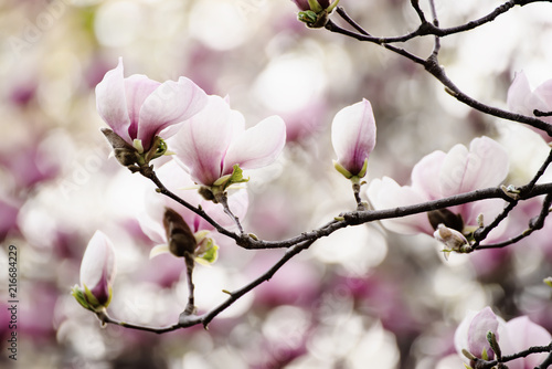 Blossoming of pink magnolia flowers in spring time, floral background