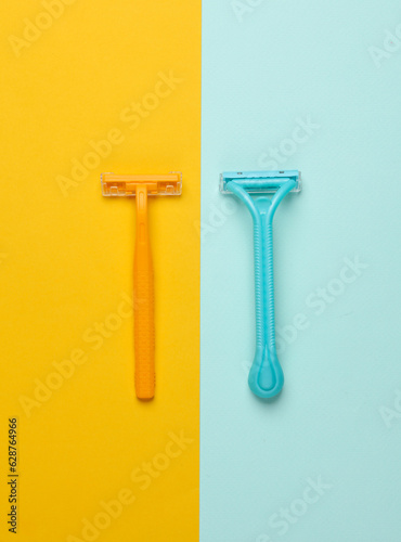 Blue and yellow Plastic razors on a colored background. Beauty concept