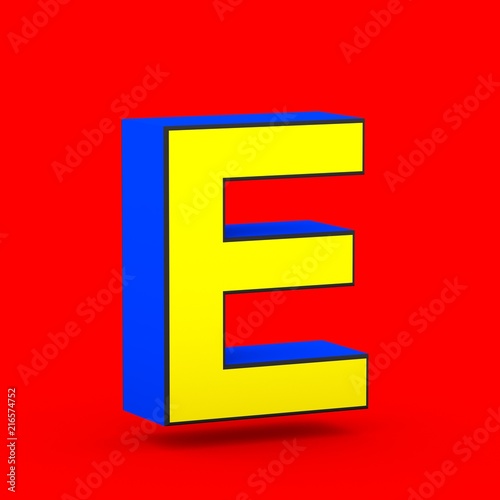 Blue and yellow superhero letter E uppercase isolated on red background.