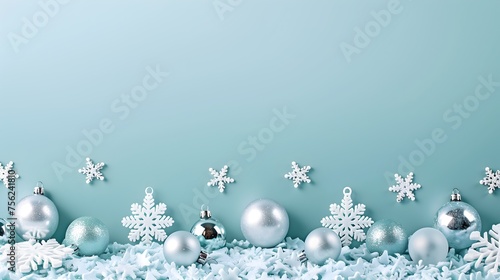 Blue Background with Christmas Ornaments And Snowflakes on the Bottom
