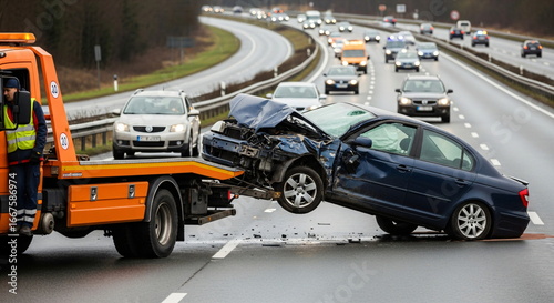 Blue broken car is taken away on a tow truck along the highway in the city, roadside assistance service. The concept of an accident and towing, footage.