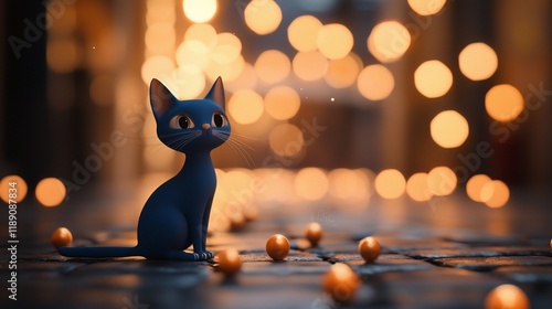 Blue cat figurine sits on cobblestones at night, surrounded by glowing orbs.