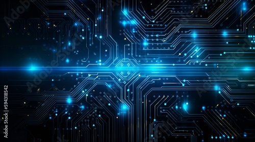 Blue circuit board background design with modern technology illustration texture and quantum computer technology concept.