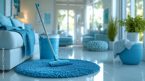 Blue cleaning supplies in a modern living room.
