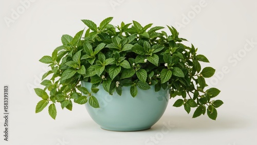 Blue container holding lively green mint leaves