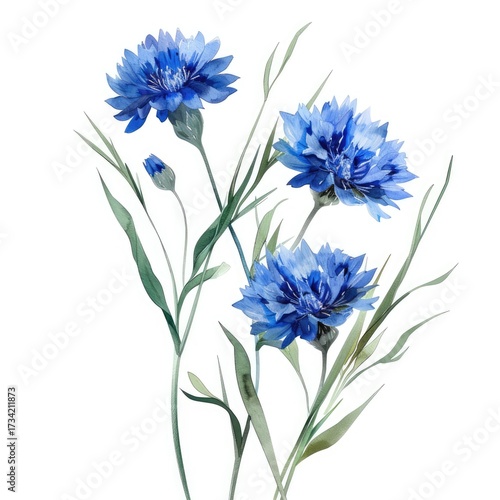 Blue cornflowers isolated on white backdrop, used in invitations, web design, prints