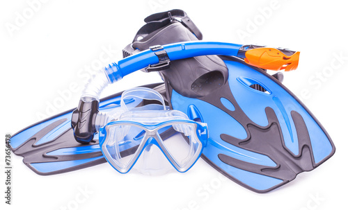 Blue diving goggles,snorkel and flippers. isolated