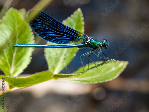 Blue dragonfly perched in green grasses by a river