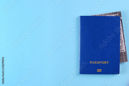 Blue external passport with airplane ticket inside on the bright blue background. Photo with a copy space