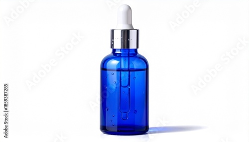 Blue glass dropper bottle with silver cap and droplets on white background.
