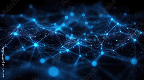 Blue glowing network of interconnected nodes and lines on a dark background representing digital connections and data flow with a futuristic and dynamic atmosphere