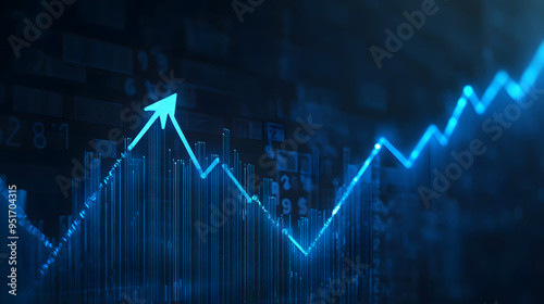 Blue growth graph business chart data diagram on success financial presentation background with abstract up arrow bar symbol or finance marketing price statistic and economy market profit investment.