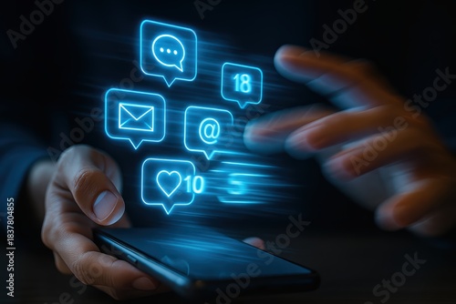 Blue Holographic Social Media Notifications Emerging from Smartphone
