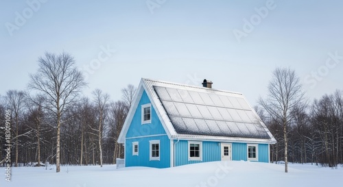 Blue house with snow covered roof standing in a cold winter landscape
