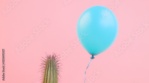 blue latex balloon hovering near spiky green cactus, pastel pink background, conceptual danger image, macro photography, soft focus