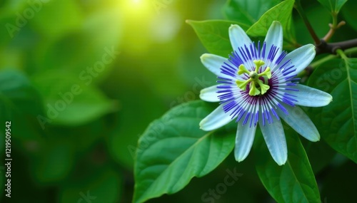 Blue passion flower blooming in a lush green environment with leaves, single bloom, flower in nature