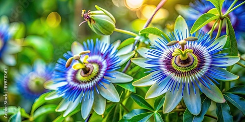 Blue passion flowers blooming in a garden , passion flowers, blue, Passiflore caerulea, garden, blooming, colorful, nature