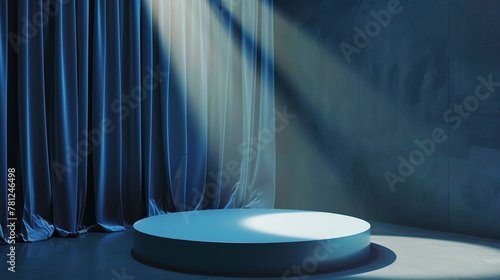 blue podium platform with spotlight on dark background for product presentation. Abstract scene of round pedestal in studio room with silk curtain. Minimal design, simple composition