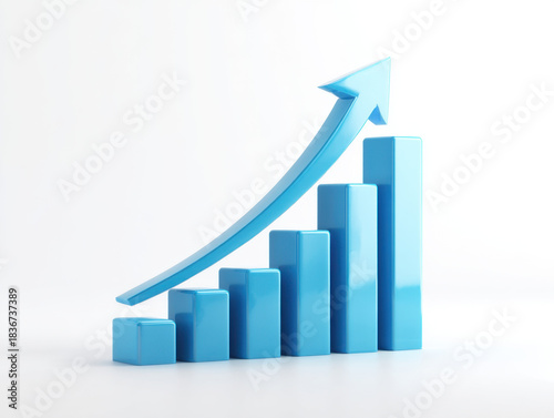 Blue rising bar chart with upward arrow indicating growth and success in finance and business, glossy 3d columns on white background conveying positive trend and progress