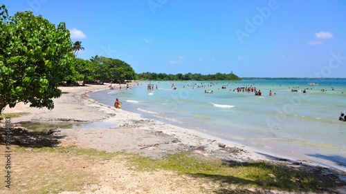 Blue sky and clouds over a tropical beach with green palm trees in Playa Larga, Cuba