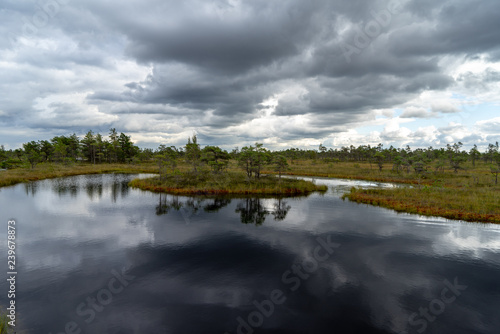 blue sky, clouds and trees from forest reflecting in calm lake water