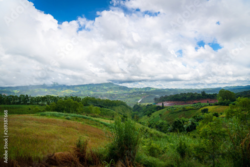 Blue sky high peak mountains fog hills mist scenery national park views at Phu Tub Berk, Khao Koh, Phetchabun Province, Thailand