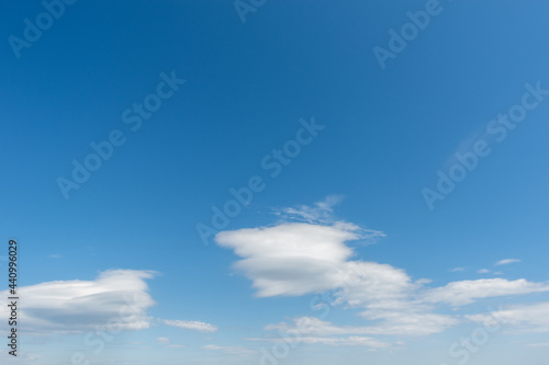 Blue sky with light fluffy swirling white clouds. Perfect natural sky background for your photos