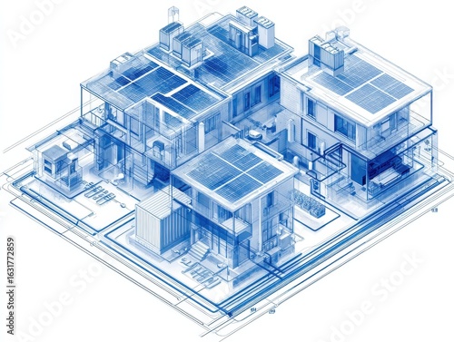 Blueprint-style 3D net-zero residential complex with solar roofing, AI climate control, battery storage, and underground water recycling, semi-transparent layers, isolated on white.