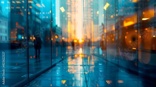 Blurred Cityscape Reflecting in Rainy Urban Street at Dusk