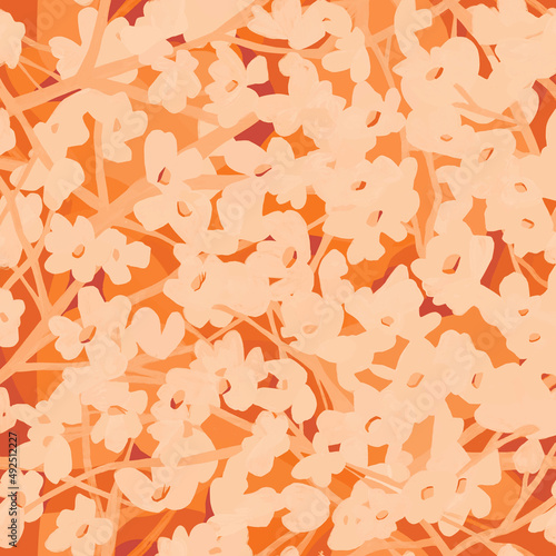 Blurred floral spring background with blooming apple tree branches in pastel coral and peach calm colors