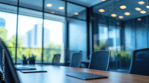 Blurred glass wall of modern business office building at the business center use for background in business concept. Blur corporate business office. Abstract windows with a blue tint.