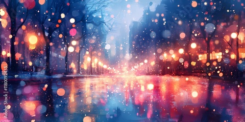 Blurred glowing bokeh lights shimmering faintly in a snowy urban background, evoking tranquil and magical winter vibes, style book illustration