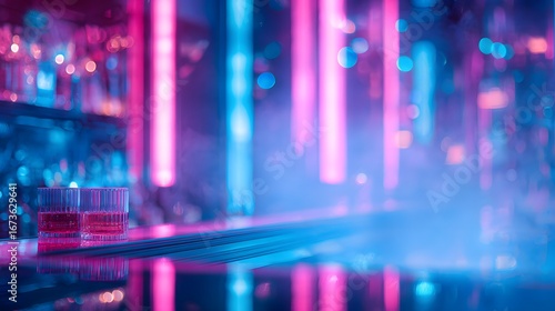 blurred image of a futuristic neon cocktail lounge glowing with electric pink and cyan neon strips across black chrome counter