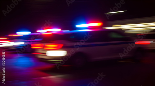 Blurred image of police cars at night with flashing red and blue lights, suggesting an emergency or law enforcement presence. Motion blur indicates movement.