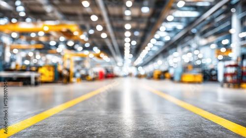 Blurred industrial facility interior with bright lights, machines, yellow floor line