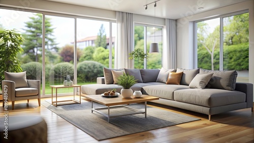 Blurred interior of light living room with grey sofas, coffee table and big window , interior, living room, blurred