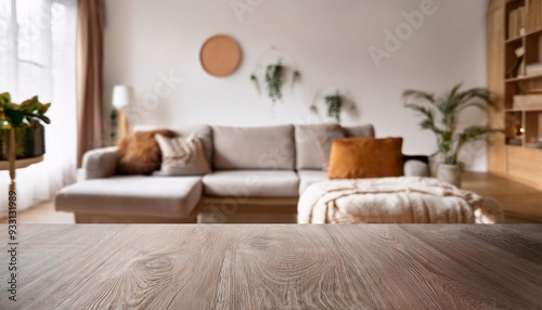 Blurred view of light living room with sofa and soft bench; unfocused background photo; selective focus