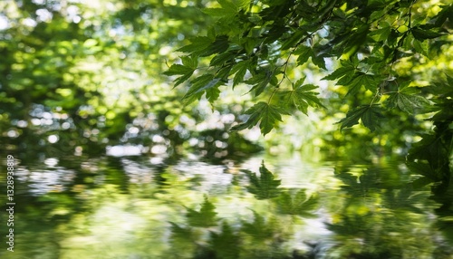 Blurry reflections of tree leaves on water, with light dancing on soft ripples, creating a dreamy and tranquil atmosphere