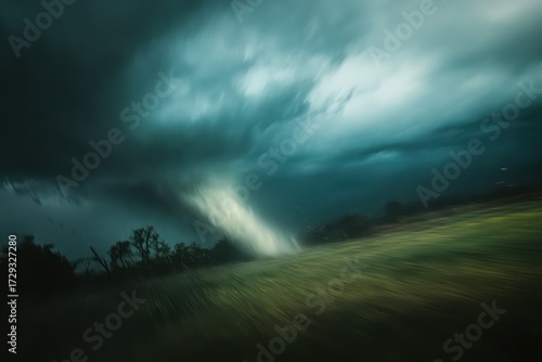 Blurry Tornado Funnel Tearing Rural Landscape Intense Storm