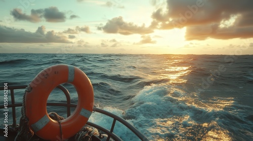 boat, against the backdrop of an expansive sea, emphasizing the importance of safety on the water and the serenity of the surroundings.