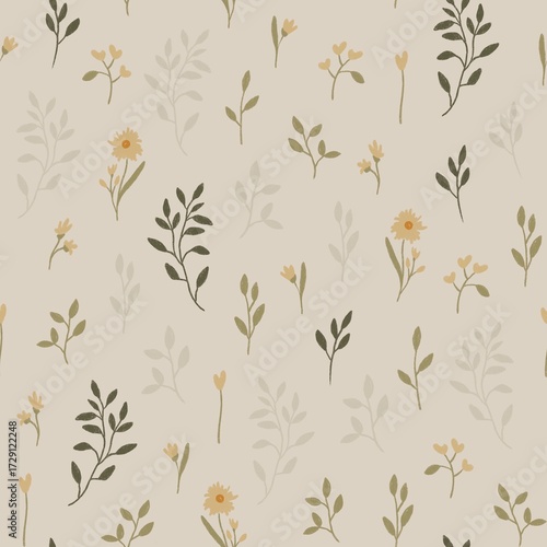 Boho autumn floral background, hand draw wildflowers, October seamless pattern