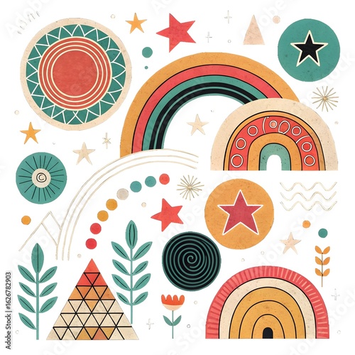 Boho rainbows and celestial elements with geometric patterns
