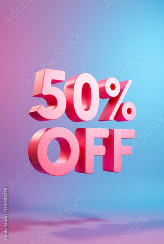 Bold pink 50 percent off discount sign against a soft gradient background in shades of blue and pink