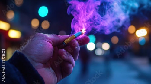 Bold purple smoke emerges from a lit cigarette, suspended in darkness like a painting of rebellion and style