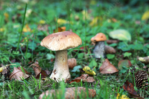 Boletus edulis (king bolete, porcini mushroom) in the forest. Selective focus.