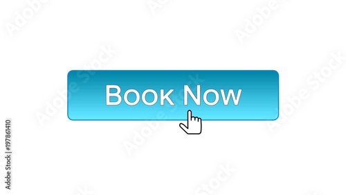 Book now web interface button clicked with mouse cursor, blue color, reservation