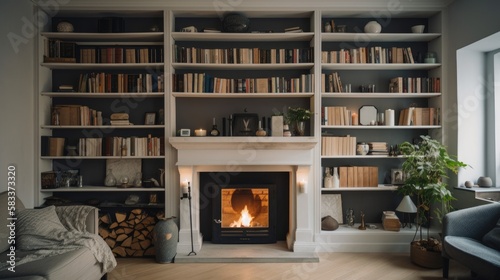 Bookshelf and fireplace in decorated living room at home, generative ai
