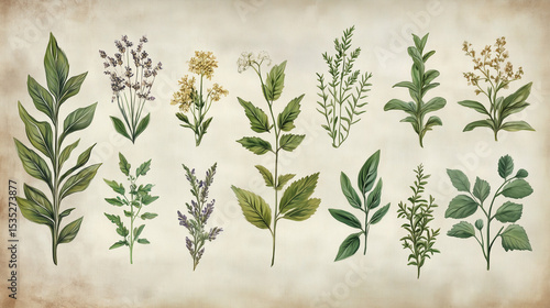 Botanical illustration of various herbs and plants on a textured vintage background