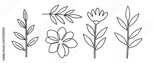 Botanical Outlines Set with Flowers and Leaves, Floral Design Elements for Decoration, Black and White Vector Illustration.