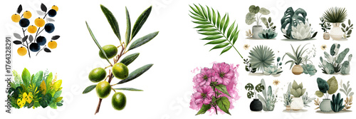Botanical Watercolor Illustrations with Diverse Plants and Flowers for Creative Design Projects on transparent background.